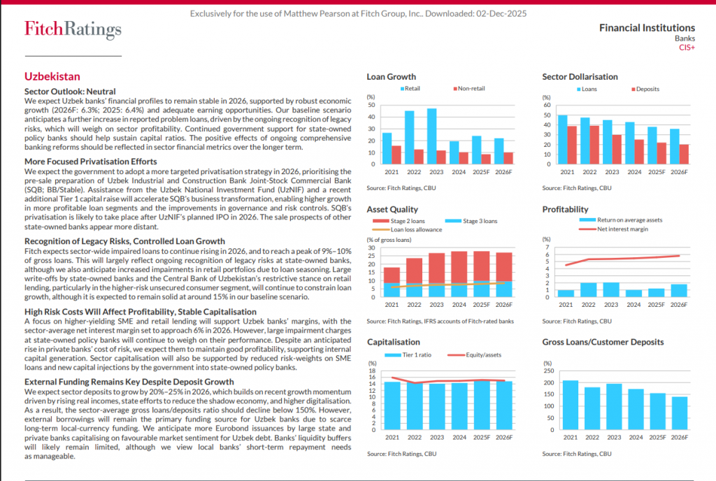 Davlat banklarida yirik kreditlarni hisobdan chiqarish amaliyoti hamda Markaziy bankning garovsiz iste’mol kreditlariga nisbatan ehtiyotkor siyosati kreditlash sur’atlarini sekinlashtirsa-da, Fitch’ning bazaviy ssenariysiga ko‘ra, 2026-yilda umumiy kredit portfeli baribir taxminan 15 foiz o‘sadi.