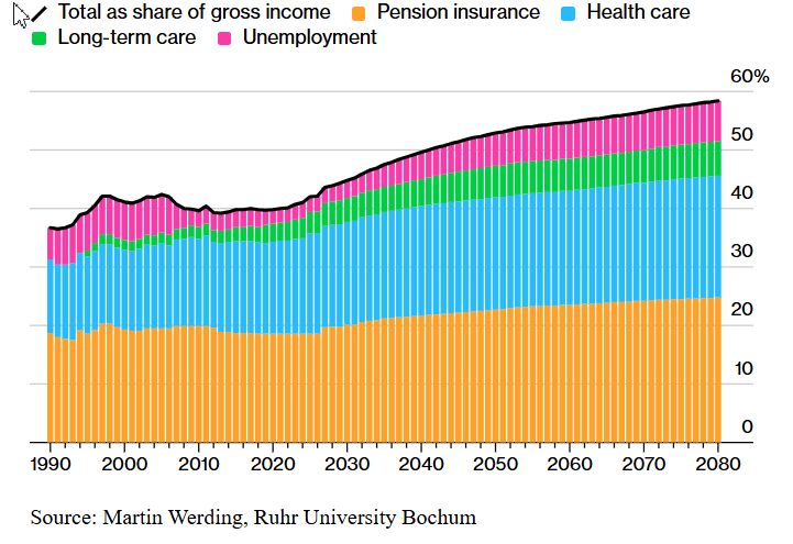 Mutaxassislarning hisob-kitoblariga ko‘ra, 2050 yilga borib kompaniyalar va xodimlar tomonidan to‘lanadigan ijtimoiy badallar ishchilarning yalpi daromadining qariyb 53 foizigacha yetadi. Germaniyada mehnat soliqlari OECD mamlakatlari orasida ikkinchi o‘rinda turibdi.